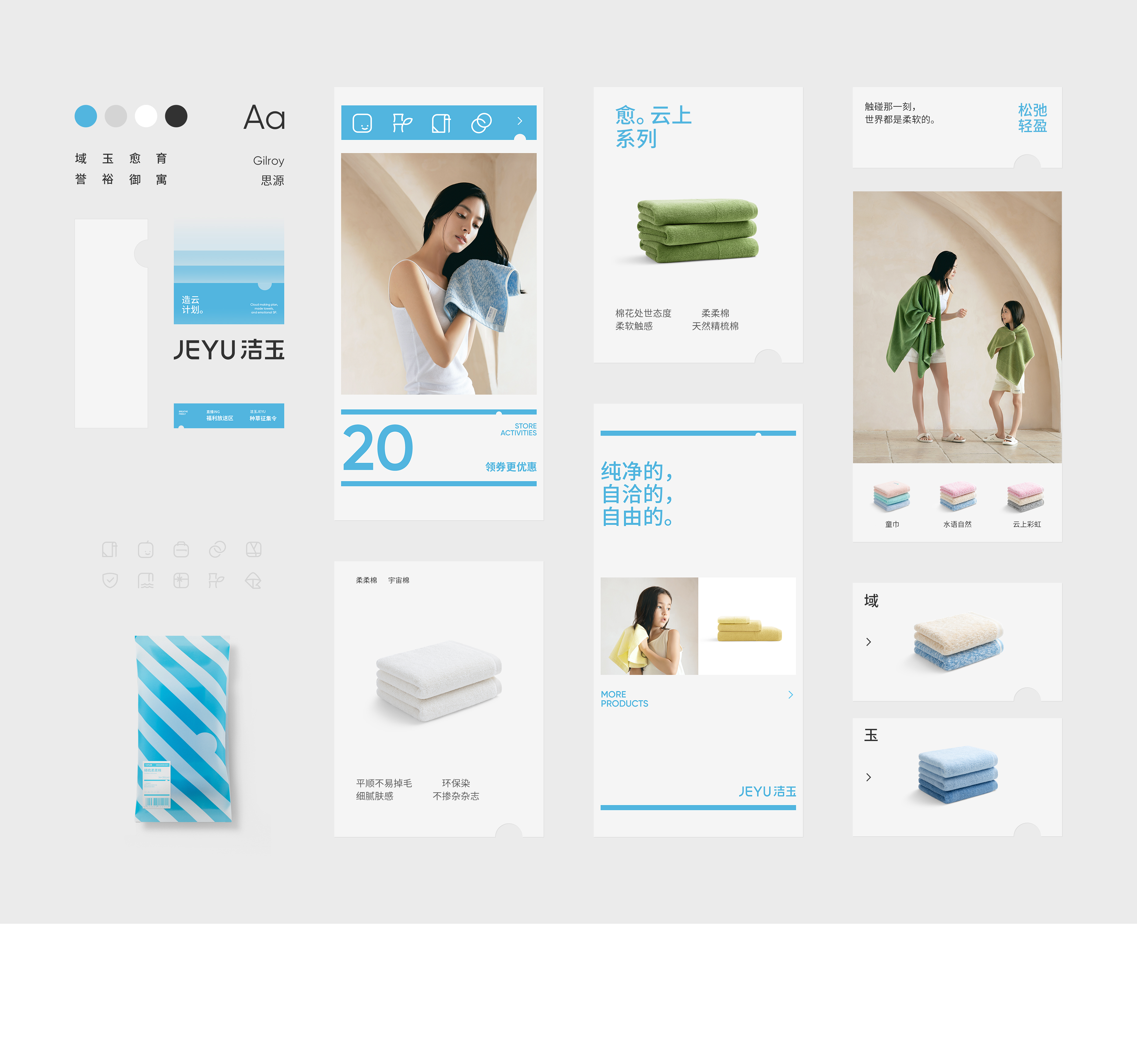 从棉花到纱线,交织出敦厚柔软的织物,我们通过诠释产品进而解读洁癖而温润的品牌精神。以图形为核心,为洁玉建立了一套兼顾前瞻性、秩序性和丰富扩展性的设计应用系统。配合自然、自洽、从容的画面和织物使用场景,构筑洁玉独特的审美风格与品牌面貌。