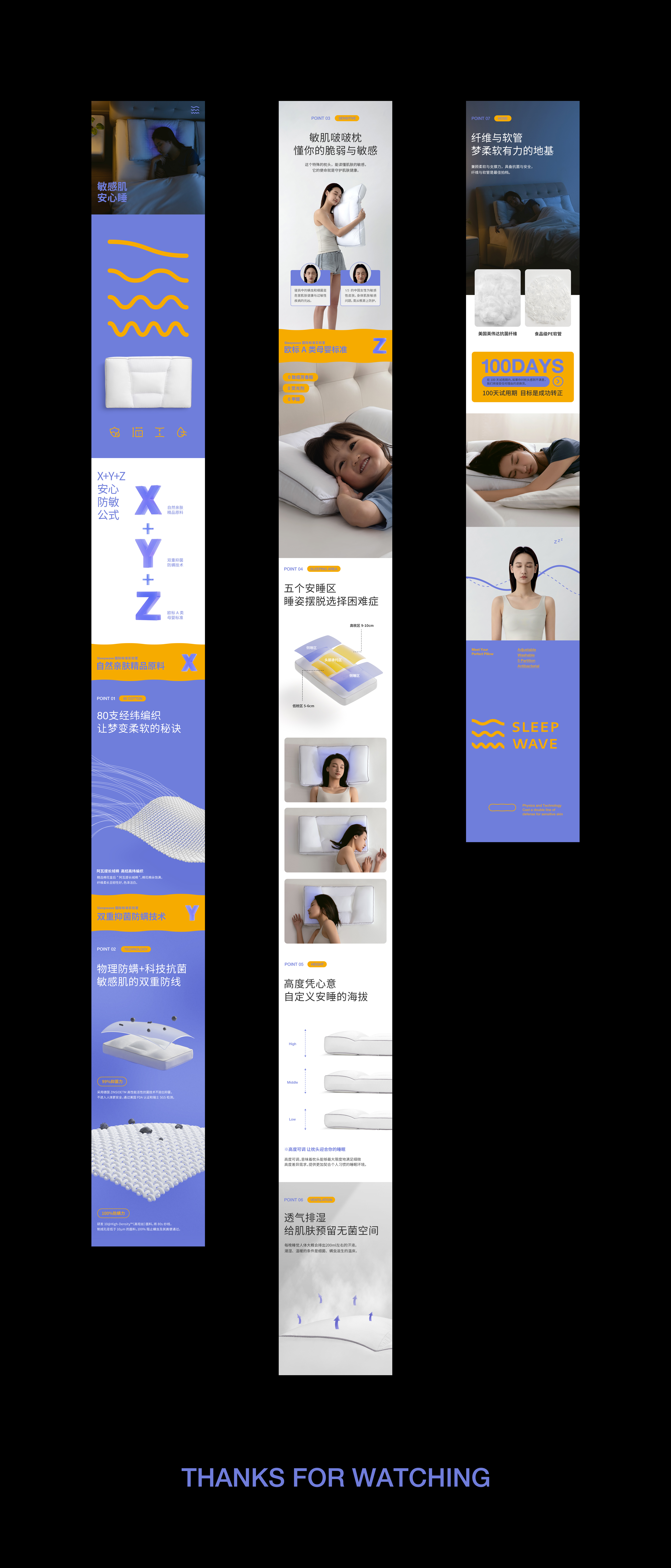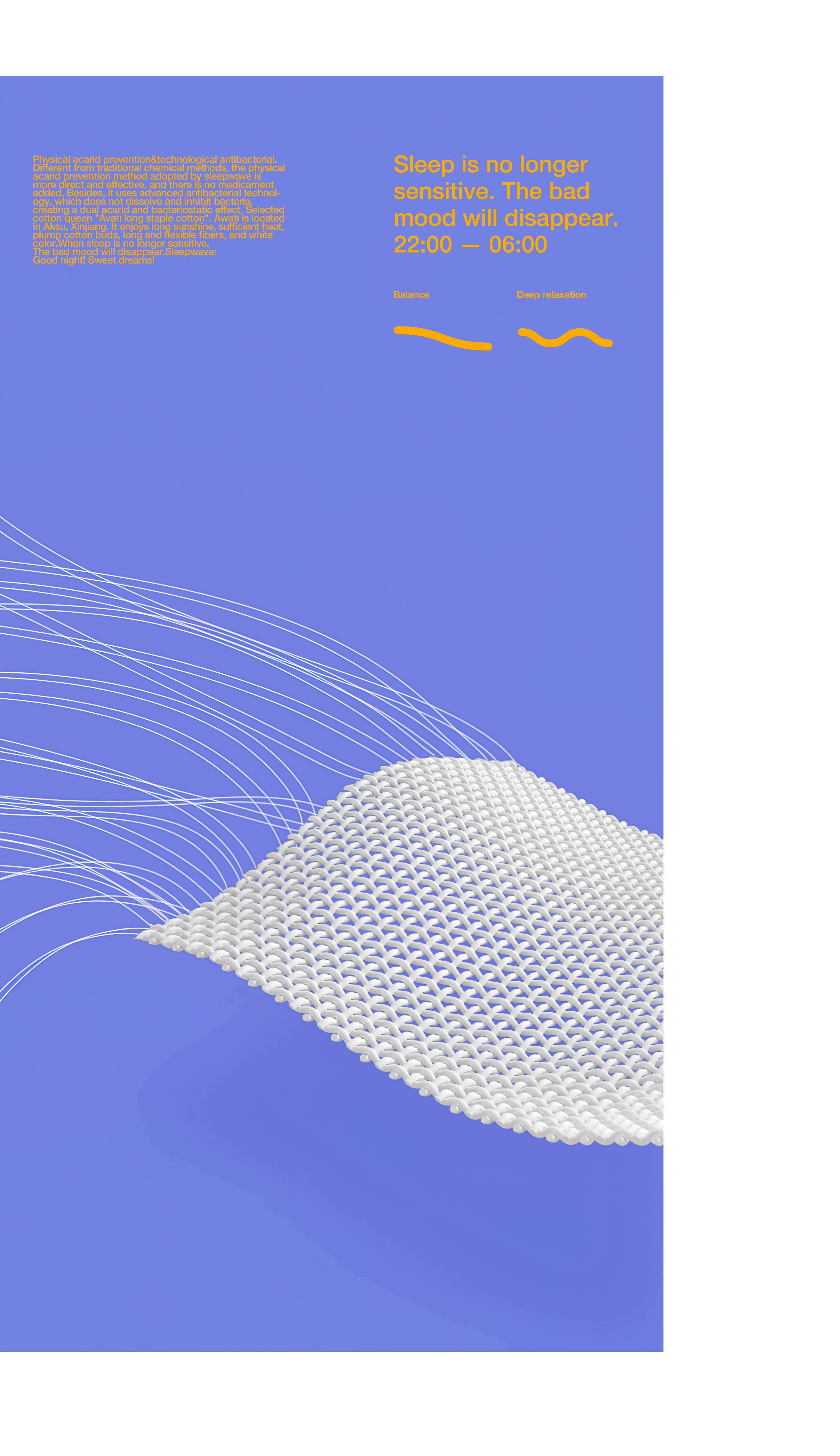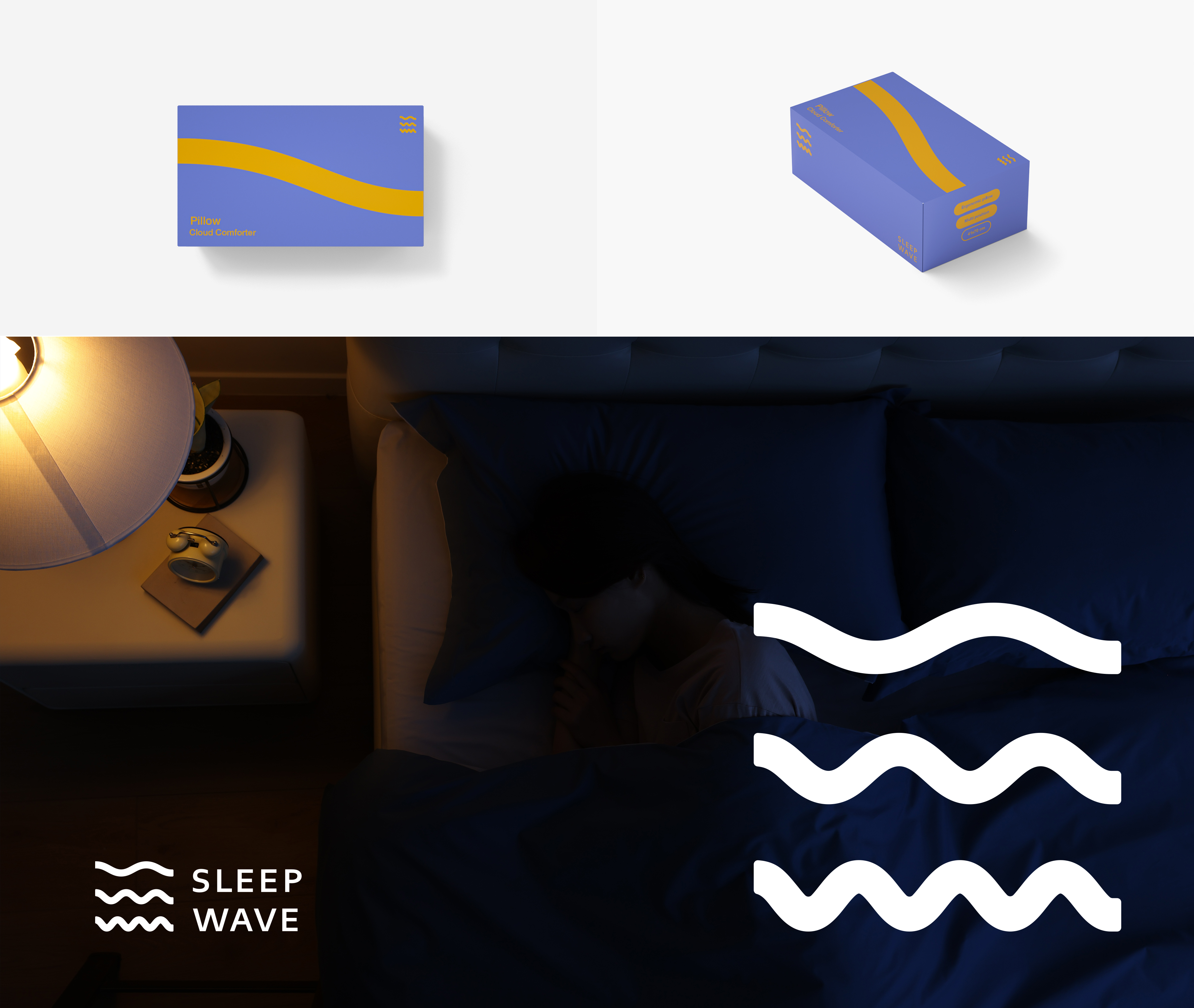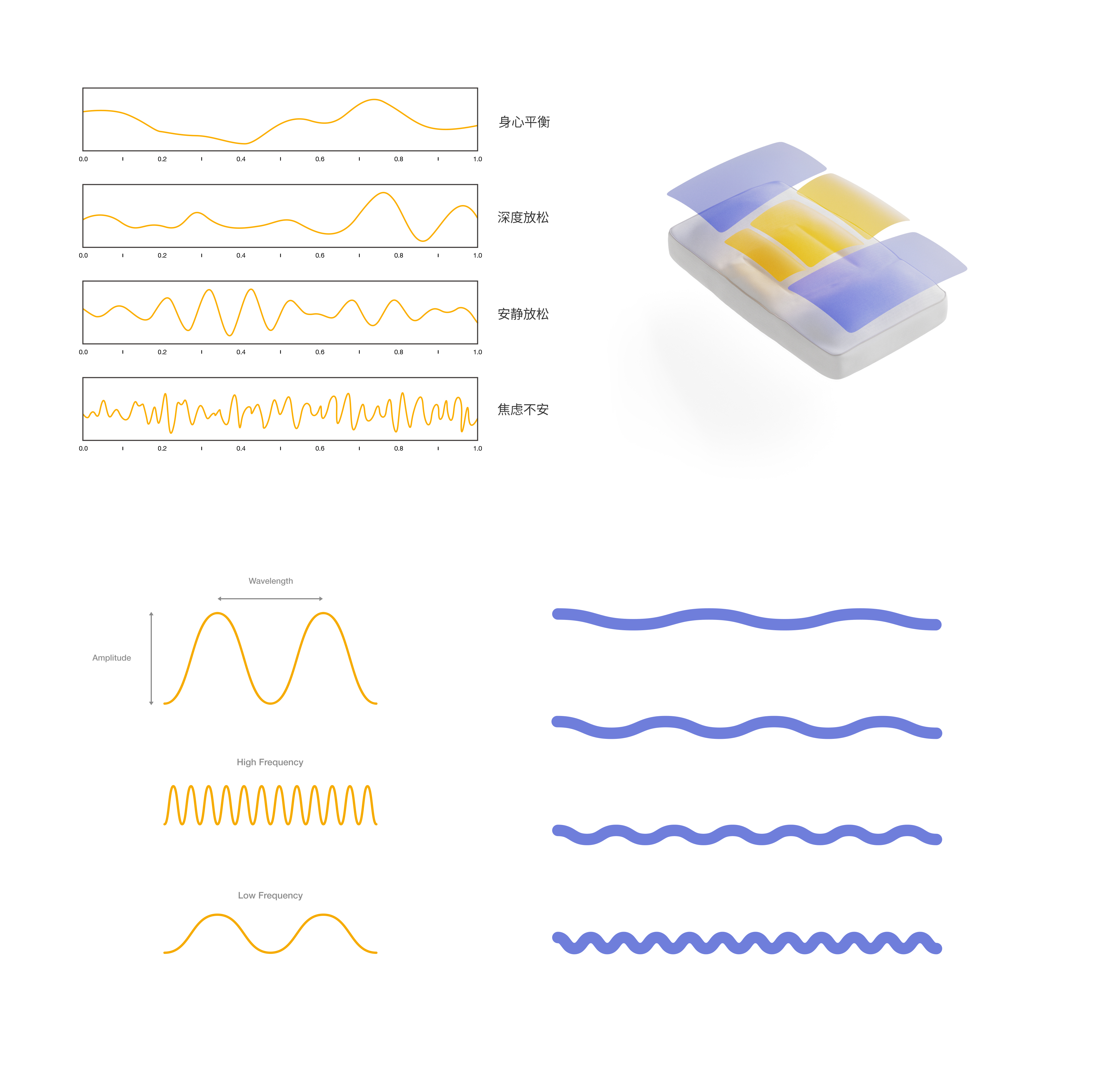 在与Sleepwave睡眠波品牌的合作中,我们的设计简化并聚焦对品牌名称和睡眠状态的描述。通过不同形态的“波”对应不同睡眠状态的大脑波频,形成一套视觉上醒目且明确的识别系统。而后将产品页的阐释与识别视觉系统进行结合,更立体的表达出产品本身的功能特质。