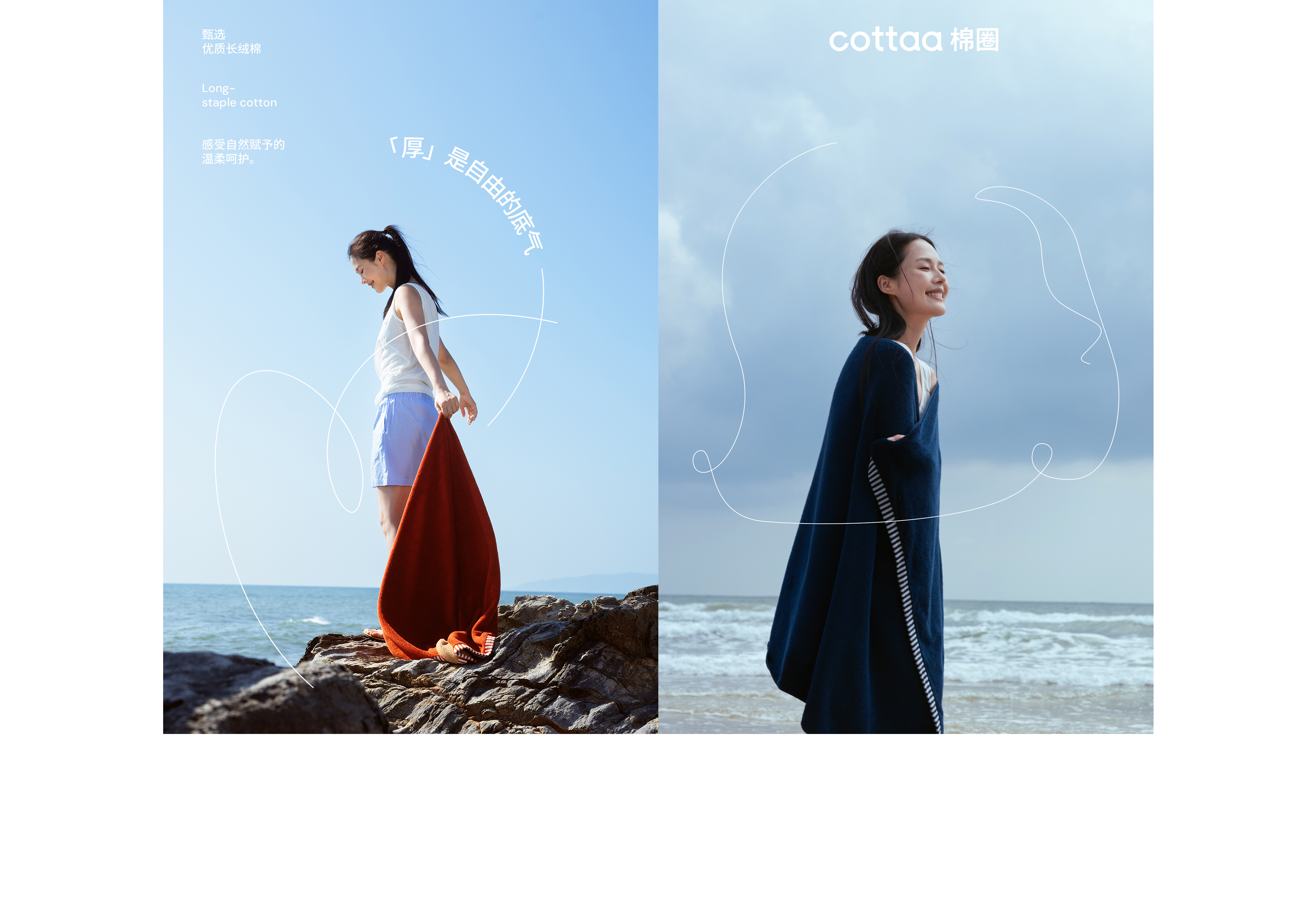 我们希望这套视觉系统为棉圈构建一个可生长的情绪容器。在这里,毛巾不仅只是清洁工具,而是阳光与欢愉的生活提案者。未来,无论产品线如何拓展,这套由棉花与海浪交织而成的视觉主脉络,都将持续传递那份自然、松弛且活力满满的品牌精神。