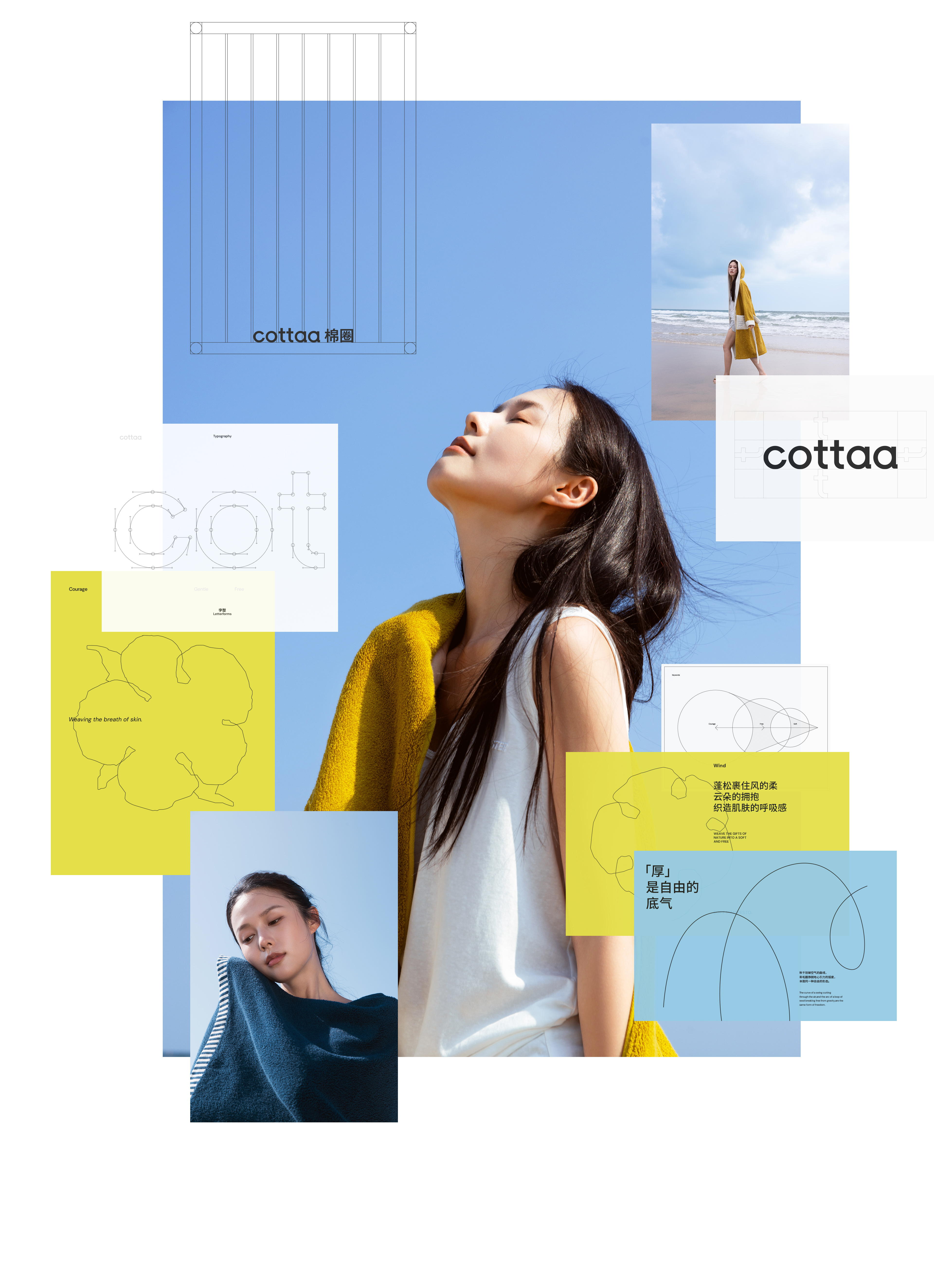 从品牌主视觉到线上产品页载体,这套符号逻辑保持了一致的延展性。棉花图形作为视觉锤反复敲击用户心智,其流动的线条更与海浪、光影形成韵律上的呼应,让整个品牌体系告别刻板,呈现出一种 “会呼吸的活力感” 。